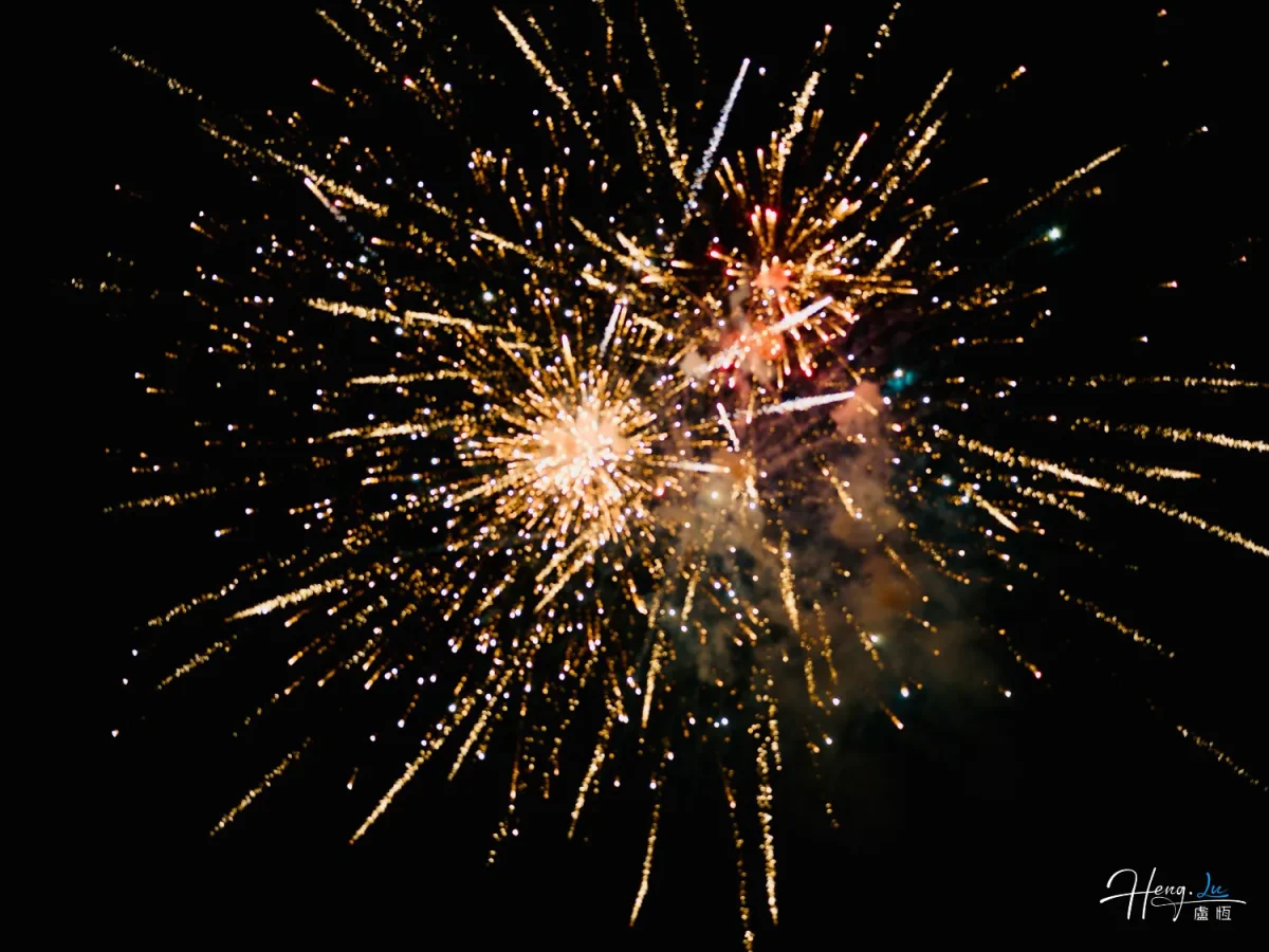A cluster of fireworks bursts into gold, red, and faint green, a storm of sparks held still. The trails reach outward unevenly, each at its own angle, like thoughts escaping a single point. The air behind them stays deep black, swallowing what burns too softly to see.
