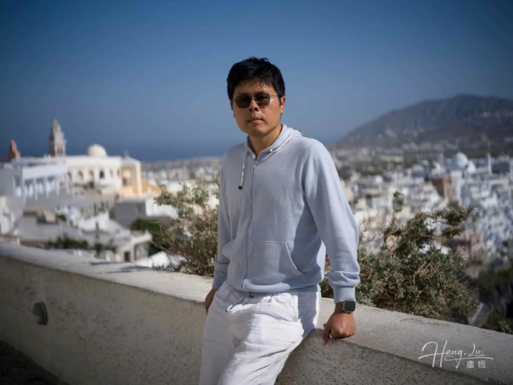 Lu Heng standing at the edge of a terrace. He’s got a hoodie zipped up, light blue, and loose white trousers. Sunglasses hide most of his expression, but he faces the camera straight on. One arm leans against the wall, casual but firm, like he’s settled into the spot.