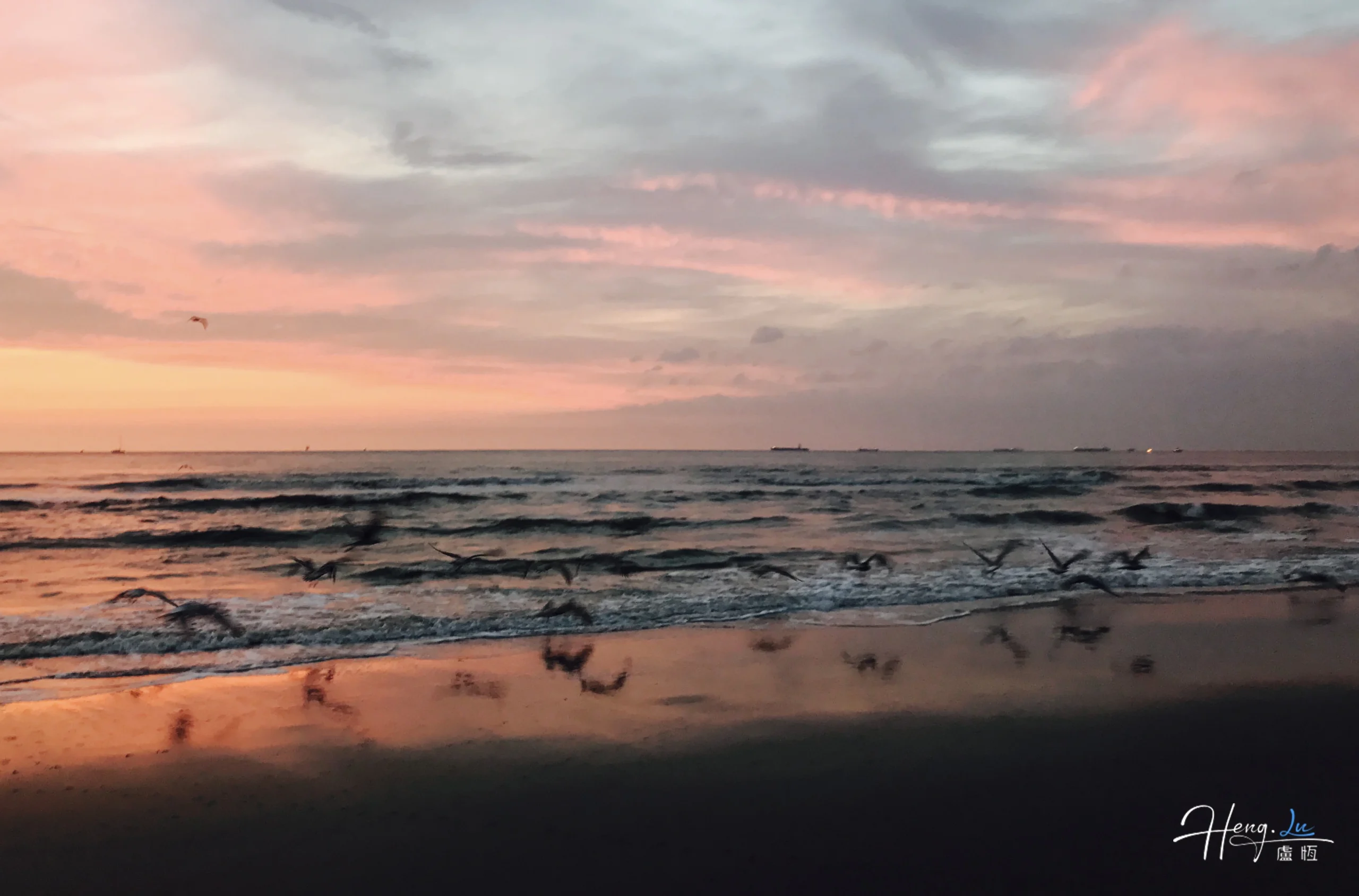 A tranquil beach scene unfolds as the sun dips below the horizon, painting the sky in soft pastel shades of pink, peach, and lavender. Gentle waves lap rhythmically against the wet sand, their foamy edges reflecting the warm, golden glow of the fading light. A flock of seagulls skims low over the water, some in graceful flight while others appear almost to dance on the mirrored surface, their wings catching the last rays of sunset. The silhouettes of distant ships dot the calm sea, adding a sense of peaceful vastness. Wispy clouds streak across the sky, tinged with rose and amber, creating a dreamy, almost painterly atmosphere. The entire scene radiates calm and natural beauty, capturing that magical moment when day softly surrenders to dusk on an empty shoreline.