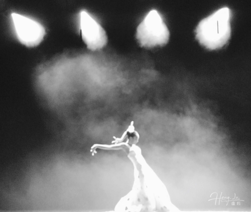 Here is a photo of some stillness and beauty on stage, in black and white. One figure stands on its own under the warm luminance of spotlights, body bent forward with arms extended in an elegant reach. Her long dress pools on the ground, soft and light, so that she seems almost to be a shape caught in mist. Ceiling lights beamed through the smoky air, like those in some distant galaxy.